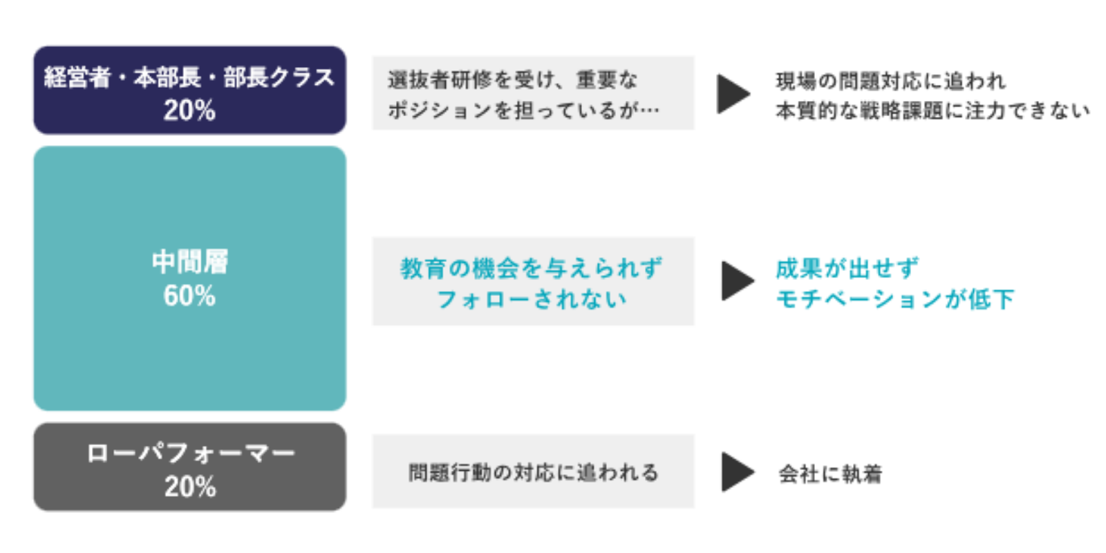 多くの企業では、「2-6-2の法則」の中間層である6割の管理職が、最も手薄にされがちです。